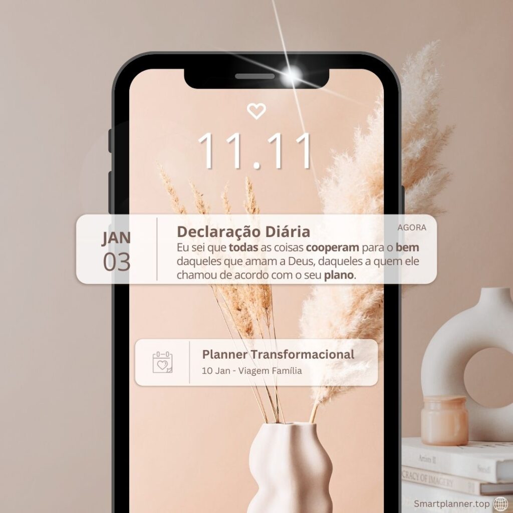 Para você que ficou até aqui, comigo, tenho um presente! Você receberá em seus dispositivos como smartphone, smartwatch, notebook, ipad e tablets, em forma de notificação, as Declarações Diárias! É algo que criei para que eu possa viver a palavra de Deus e adicionei ao Planner Transformacional para a versão de 2024, e estou compartilhando agora com você.